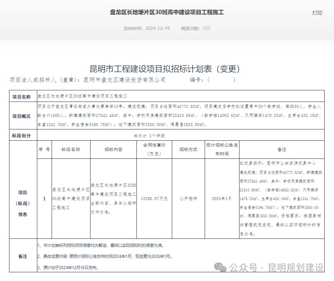 12月19日,云南省公共资源交易信息平台发布《盘龙区长地埂片区30班高中建设项目工程施工》招标计划。该项目计划投入约1.23亿元,于2025年1月进行公开招标。