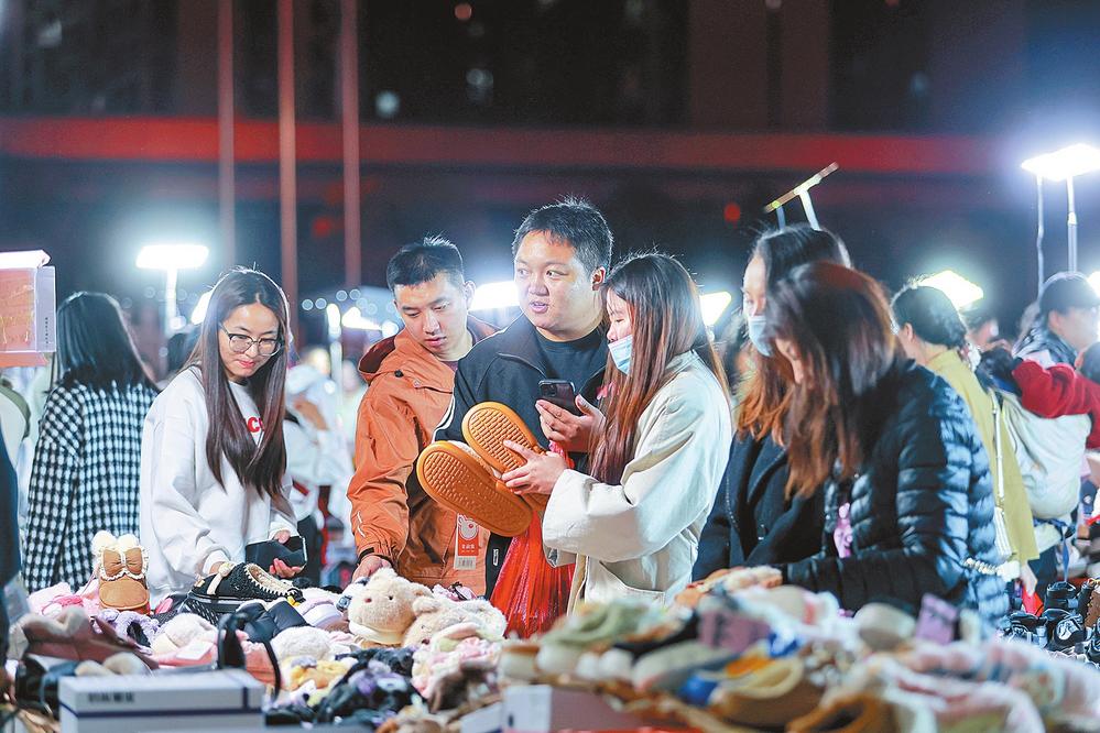 顾客在新螺蛳湾国际商贸城滇忆465米轨夜市购物。云南日报记者胡妤雅/摄