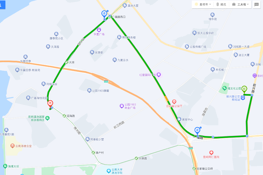 前兴路公交车场——迎海路口(滇池路)(直达车)。