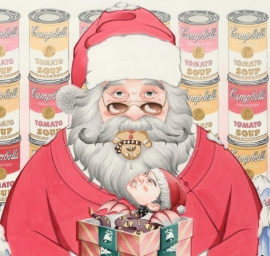 在《Curiosity》这幅画中,背景是安迪沃霍尔的金宝汤罐头,营造了节日里的热闹和喜庆,但作为画面主体的圣诞老人,嘴里咬着一块姜饼人,礼盒里蹦出来一个人首蛇身的怪物,呈现了荒诞又惊悚的氛围,与节日形成了巨大的反差,让人情不自禁地想问“这个圣诞老人究竟是谁?”