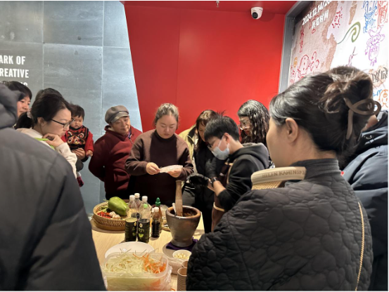 活动中,大人孩子一起制作曲奇饼干,在饼干上绘制他们对2025新年的美好祝愿,分享制作泰国美食木瓜沙拉,小朋友们参与课堂文化知识问答,检验学习成果,让知识之旅更加有趣。
