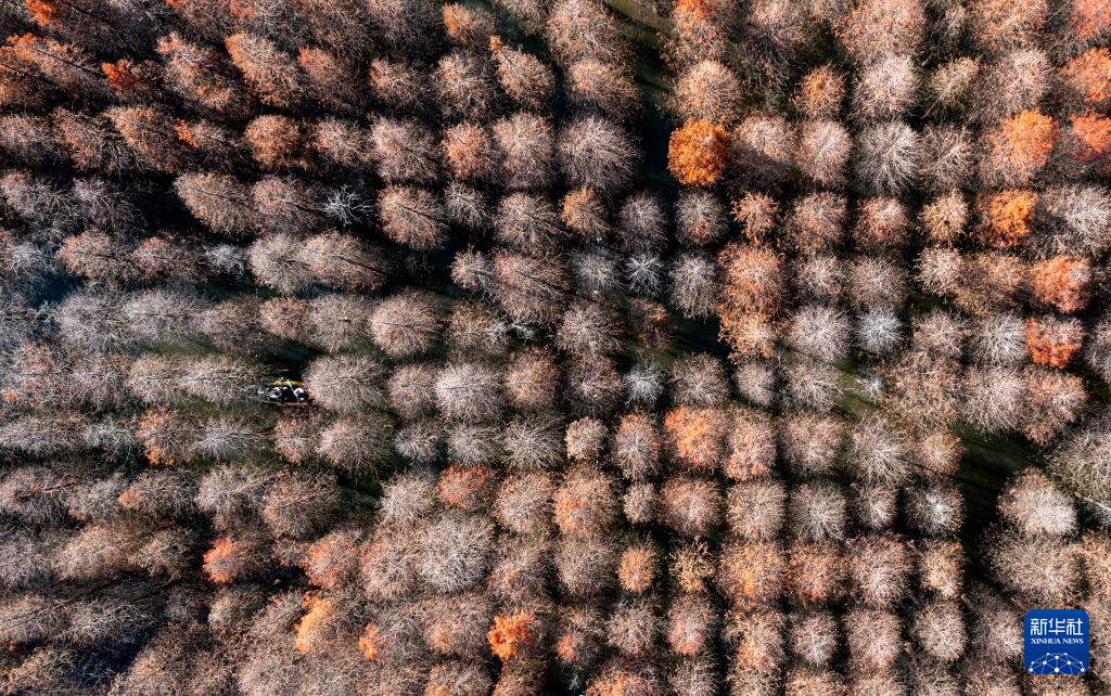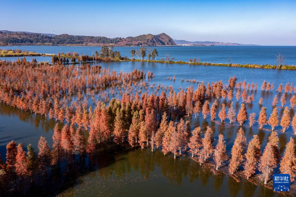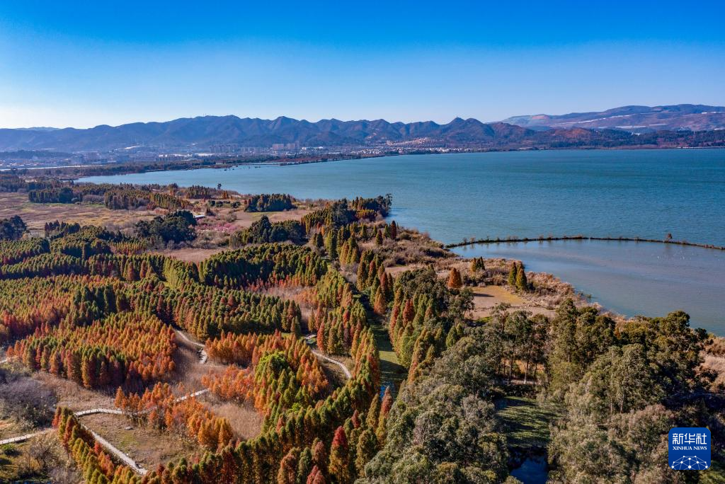 这是12月29日拍摄的昆明晋宁南滇池国家湿地公园内的水杉(无人机照片)。新华社记者 陈欣波 摄