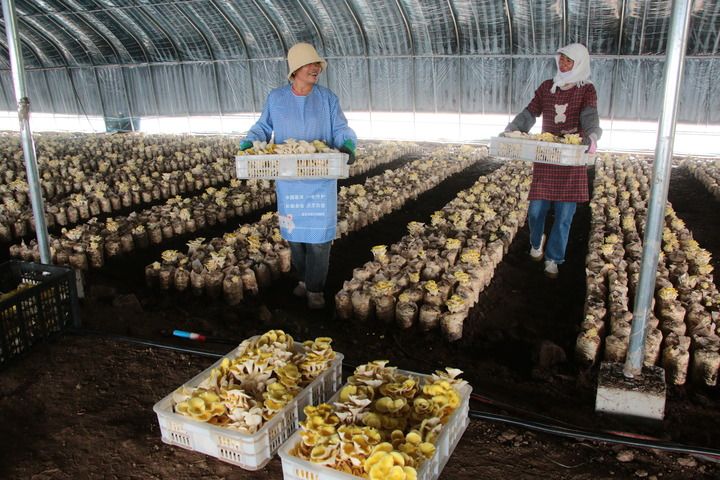 宁夏固原市隆德县山河乡菜子川村村民在采收菌菇。(隆德县委宣传部供图)