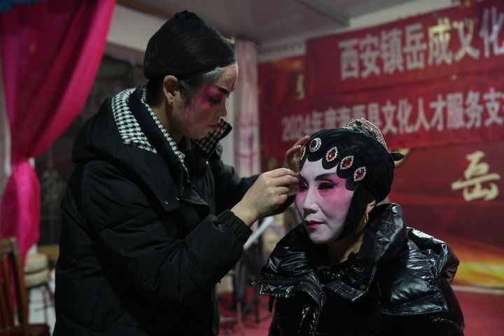 2025年1月1日,在宁夏中卫市海原县西安镇岳成文化大院,秦腔演员们正在化妆。新华社记者 邹欣媛 摄。