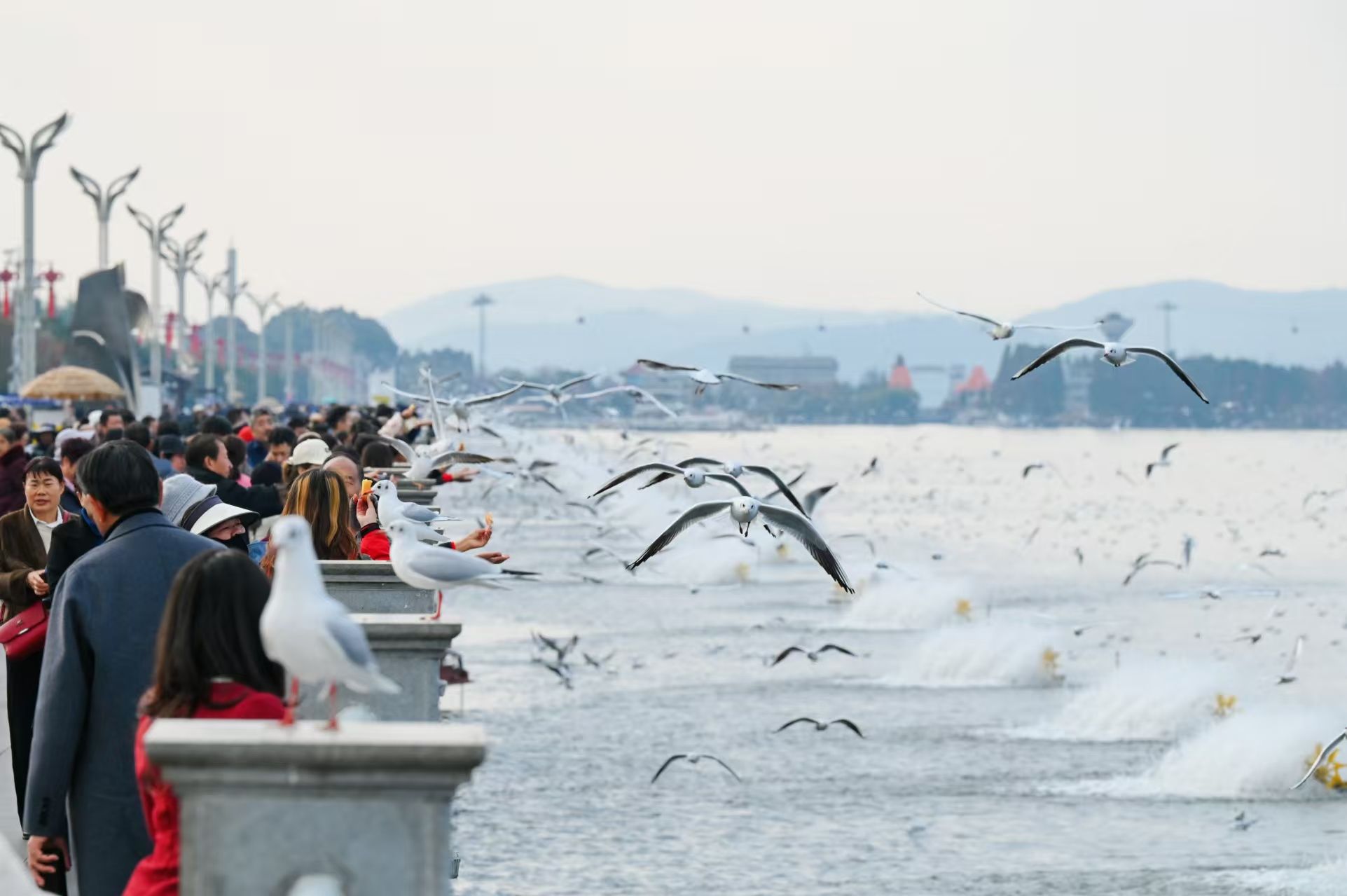 活动当天,飞舞盘旋的红嘴鸥成群结队,沐浴着温暖的阳光,时而翱翔空中,时而掠过水面,成为滇池一道独特的风景。前来观鸥的市民、游客络绎不绝,纷纷与红嘴鸥互动拍照,场面温馨和谐。
