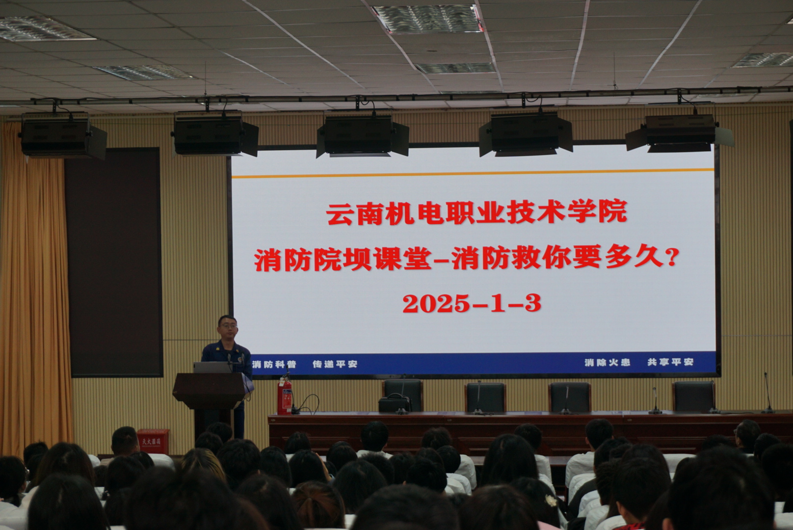 昆明信息港讯 记者劳学丽 1月3日下午,盘龙区消防救援大队联合云南机电职业技术学院开展的第70场消防安全“院坝课堂”在该校龙泉校区进行培训及现场消防演练。为让学校师生同步学习消防安全知识,除200名师生参加现场学习,全校近一万名师生还通过直播课堂观看了培训及演练内容。