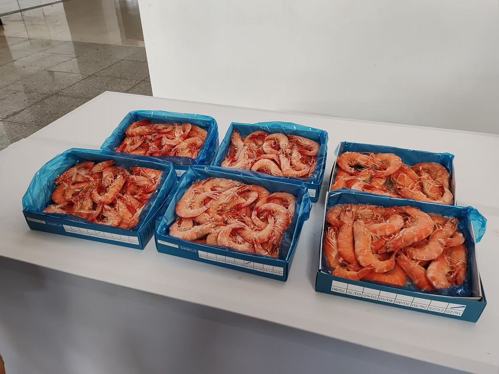 在昆明明品福东盟国际冷链物流中心,工作人员迅速对这批刚刚抵达的熟冻虾进行严格的检验流程,以确保海产品的运输质量和食品安全。这批熟冻虾将通过市场渠道,作为春节期间的特色年货供应给广大消费者。