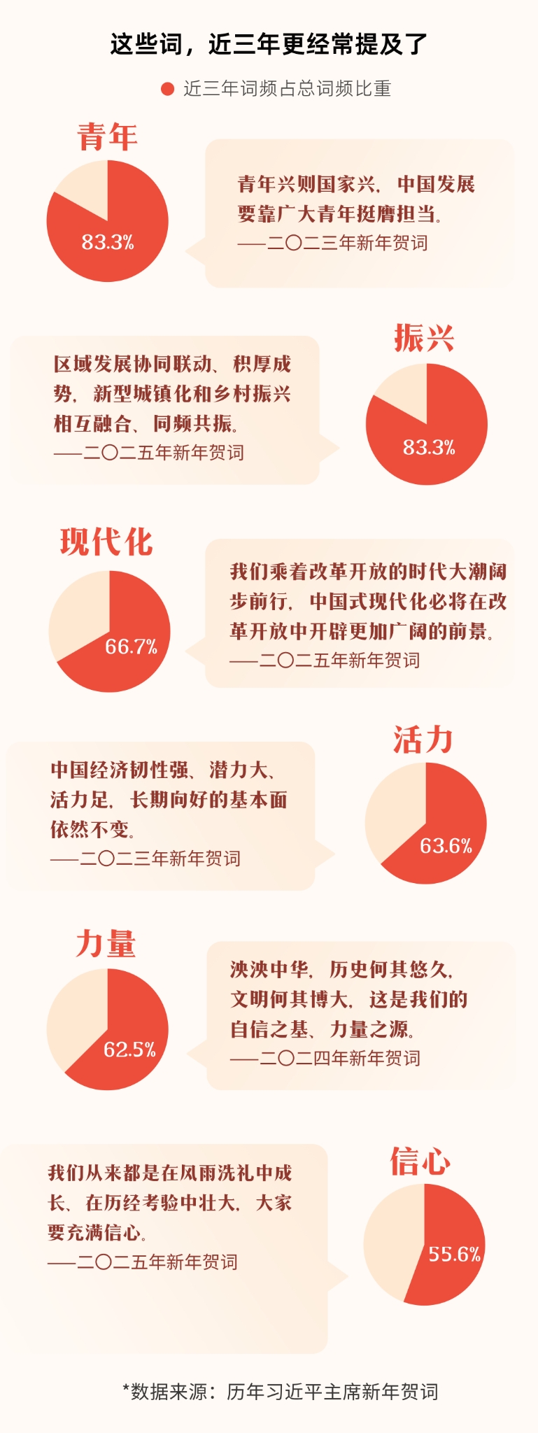 通过分析党的二十大以来的新年贺词,可以看到近三年来,习近平主席在新年贺词中特别强调了“青年”“振兴”“现代化”“活力”“力量”和“信心”等关键词。