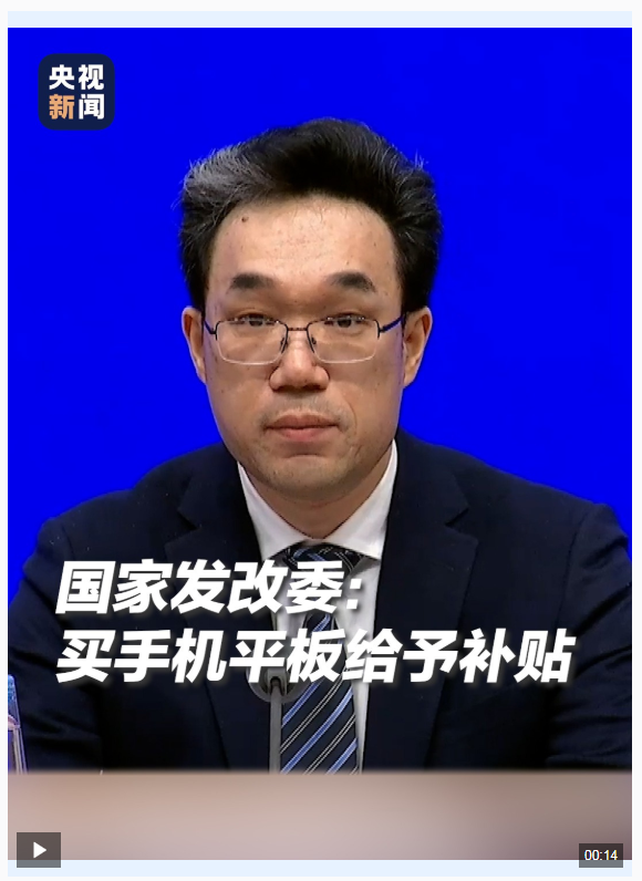 据国家发改委相关负责人介绍,今年的“两新”工作将加力扩围。消费品以旧换新方面,对个人消费者购买手机、平板、智能手表手环等3类数码产品将给予补贴,具体方案预计会尽快公布。