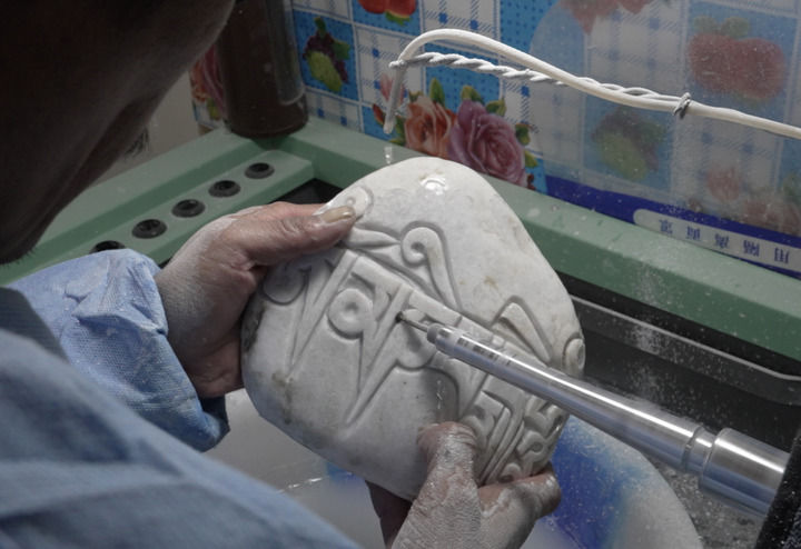 2024年10月17日,村民在岗巴布民族手工艺品专业合作社内雕刻玛尼石(视频截图)。新华社发(杜笑微摄)