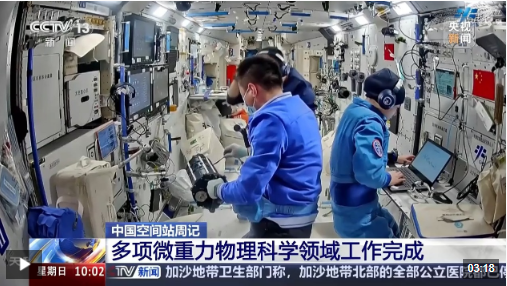 在微重力物理科学领域,乘组完成了流体物理实验柜、高温材料实验柜内实验样品更换,无容器柜实验腔体样品清理、轴心机构电极维护等工作。