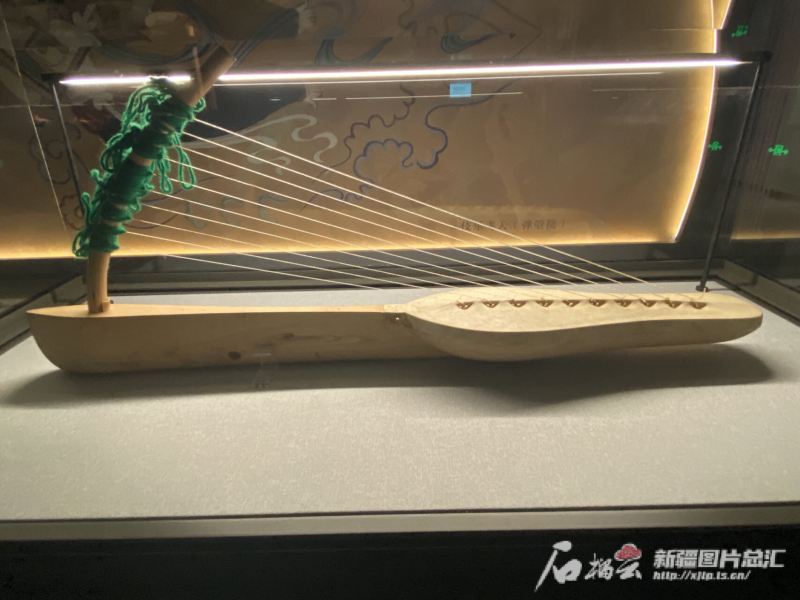展厅中的螺钿槽箜篌(复制品),原件藏于日本正仓院。石榴云/新疆日报记者 赵梅摄