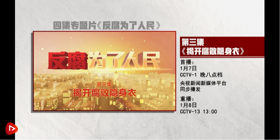 以习近平同志为核心的党中央对坚决打赢反腐败斗争攻坚战持久战作出重要部署,强调惩治新型腐败和隐性腐败,要求丰富防治新型腐败和隐性腐败的有效办法。新型腐败、隐性腐败花样翻新,掩饰权钱交易手段更趋隐蔽复杂,污染的是政治生态,破坏的是市场经济秩序,损害的是老百姓切身利益。电视专题片《反腐 为了人民》第三集《揭开腐败隐身衣》,讲述纪检监察机关贯彻落实党中央决策部署,不断深化对反腐败斗争的规律性认识,时刻紧盯新型腐败和隐性腐败,持续丰富防治的有效办法,揭开腐败隐身衣,确保党和人民赋予的权力始终用来为人民谋幸福。央视综合频道1月7日晚8点档播出,央视新闻新媒体平台同步播发,敬请关注。
