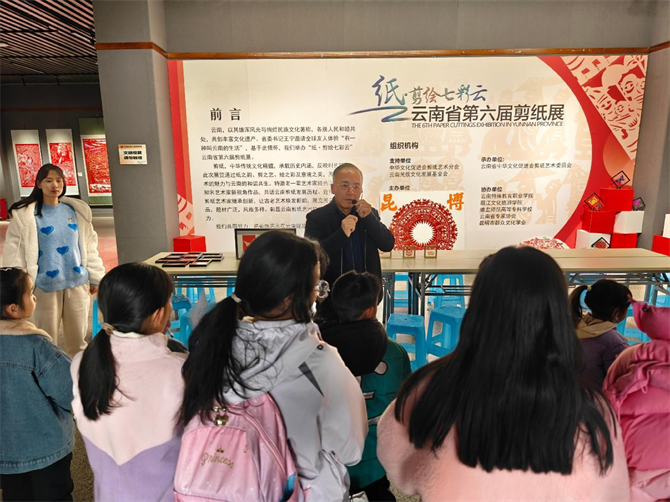“指尖舞动、纸上绽放。”当天,博物馆热闹异常,小朋友们跟随着讲解员穿梭于剪纸展览之间,剪纸作品背后的历史文化和故事,让他们不由自主地停下脚步细细欣赏。活动还邀请到云南省中华文化促进会剪纸分会副秘书长罗磊,以及罗氏剪纸第五代传承人罗艺灵。他们作为剪纸技艺体验环节的指导老师,带领少年们学习折叠和剪裁技巧。纸张在他们的手指间轻盈地舞动着,仿佛赋予了纸张生命,不一会儿,一件件充满创意的剪纸作品就诞生了。在专家老师们富有魔力的引导下,最终孩子们都创作出了别具一格的剪纸作品。