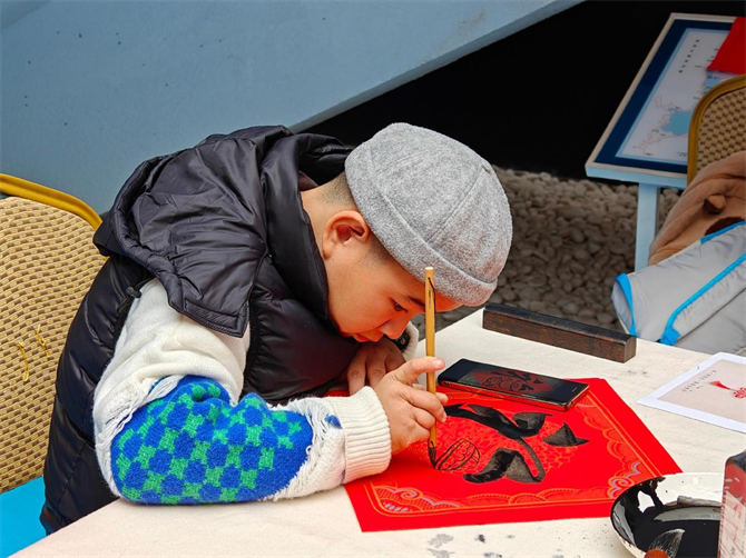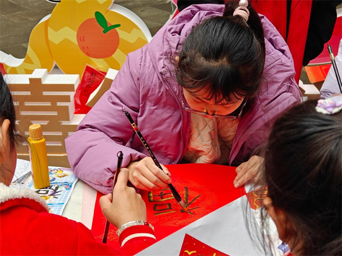 “挥毫泼墨、新春送福。”对联创作区墨香弥漫,无象艺术空间与云南朗吟文化传播有限公司的六位书法老师——李继华、熊廷献、杨富云、李闻梁、蒋超卓、廉文杰,一边向孩子们传授对联的格律和意义,一边亲自示范书写的技巧。毛笔在书法老师们的手中就像有了生命一样,在宣纸上灵动地游走,孩子们沉醉在传统文化的独特魅力之中。现场,大小朋友积极挑选自己喜爱的对联,书法家们挥毫泼墨,一撇一捺,一幅幅充满吉祥祝福的春联就完成了。