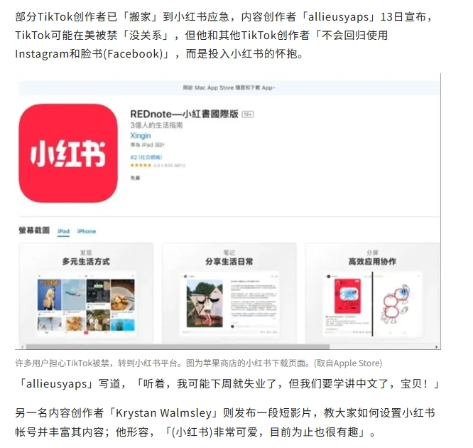 法新社和财联社的报道指出,随着TikTok禁令传闻愈演愈烈,许多使用TikTok的外国用户和博主迫切寻找替代平台。小红书因其强大的内容生态和互动功能,迅速吸引大批北美和欧洲地区的用户注册。