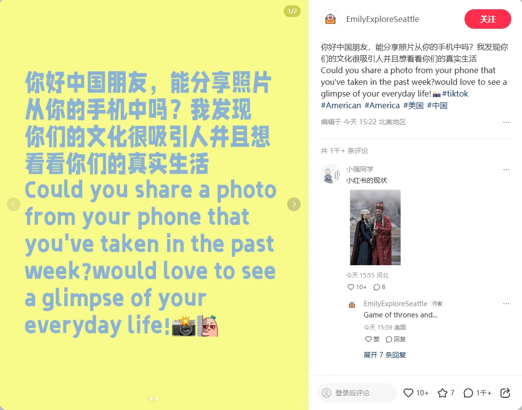 与此同时,国内用户也表现出极大的好奇心和热情,积极欢迎这些海外“新朋友”。小红书评论区俨然成为跨文化交流的“互动大课堂”,中国网友向美国用户学习英语,而海外网友则向中国用户了解当地文化、习俗,甚至中文表达。有趣的是,不少中国小学生抓住机会,向海外用户请教英语作业,评论区瞬间变身“在线外教一对一”教学现场。这种轻松且高效的互动形式,不仅拉近了中外用户的距离,还推动了文化的双向传播。中国用户通过这些交流开阔了国际视野,而海外用户则感受到中国社交媒体的独特魅力。