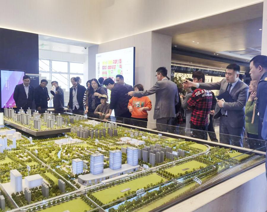 This photo taken with a mobile phone shows people watching a sand table model of a real estate project in east China's Shanghai, May 28, 2024. (Xinhua/Zheng Juntian)