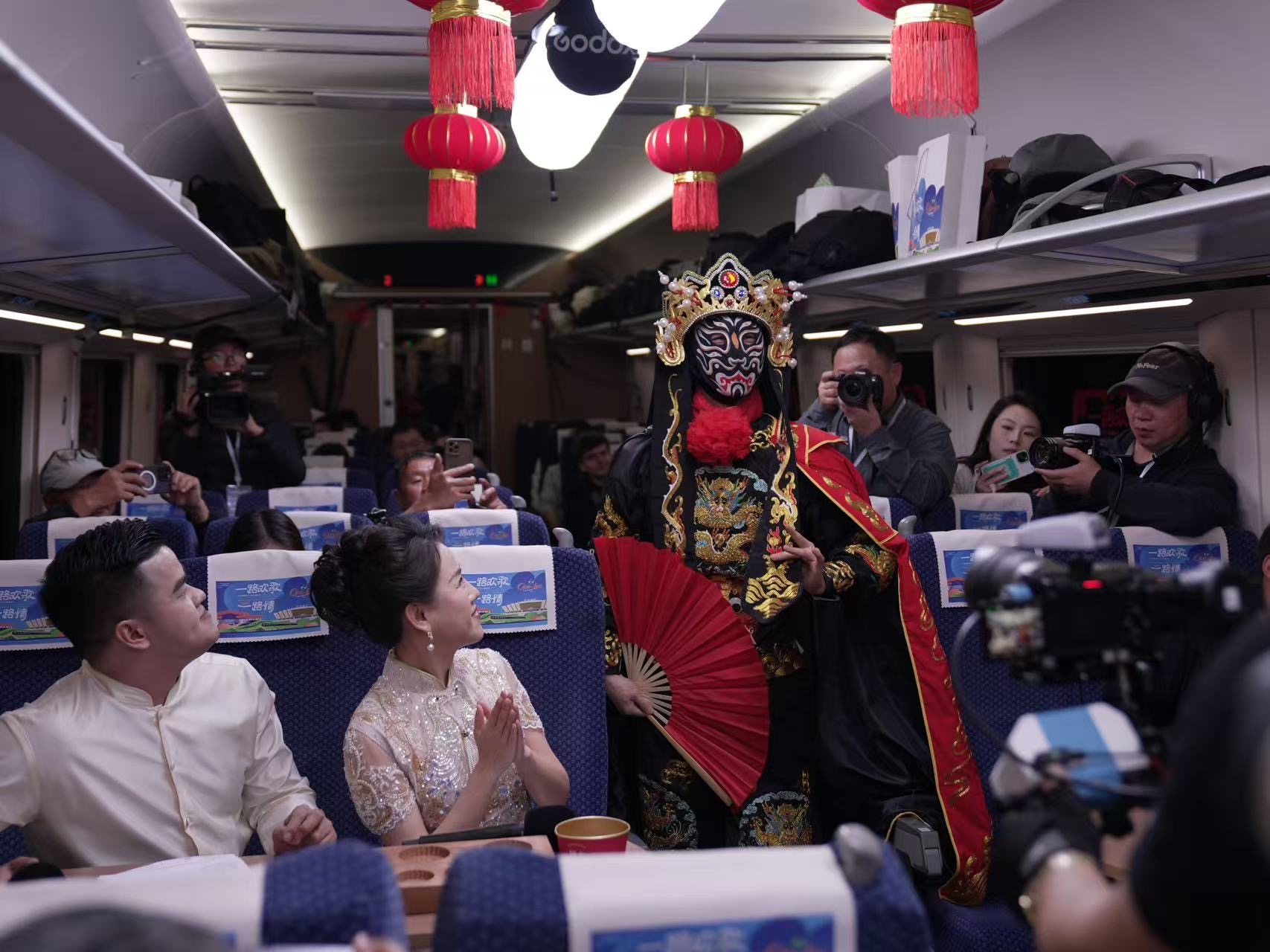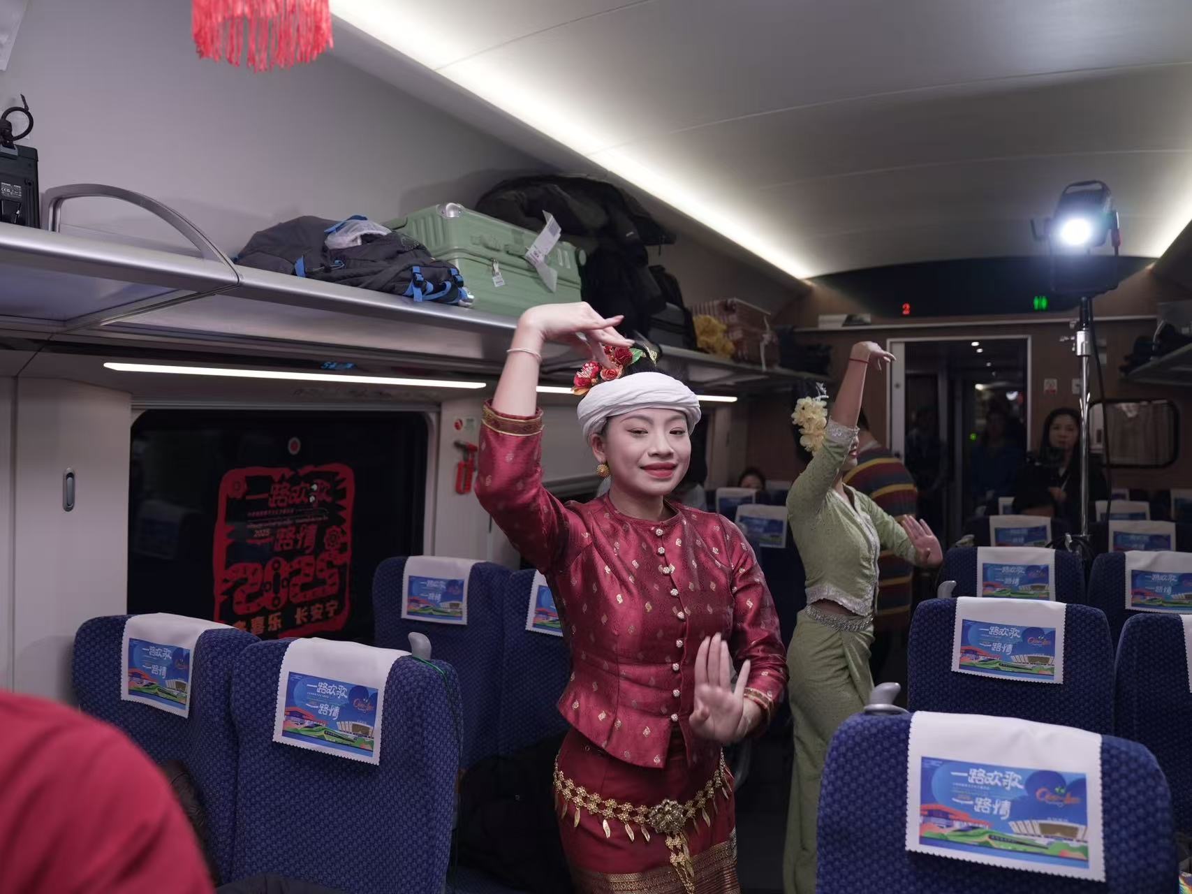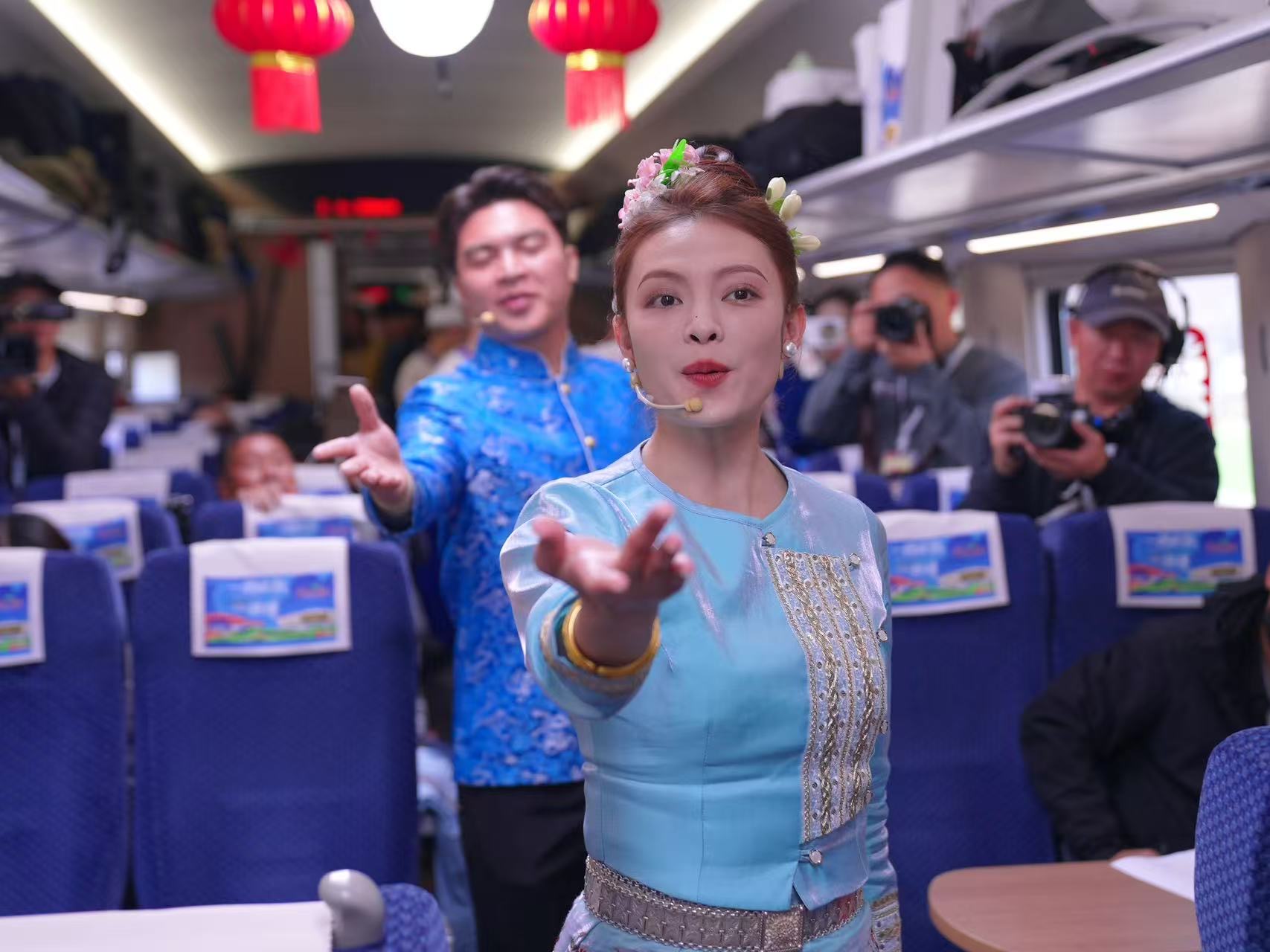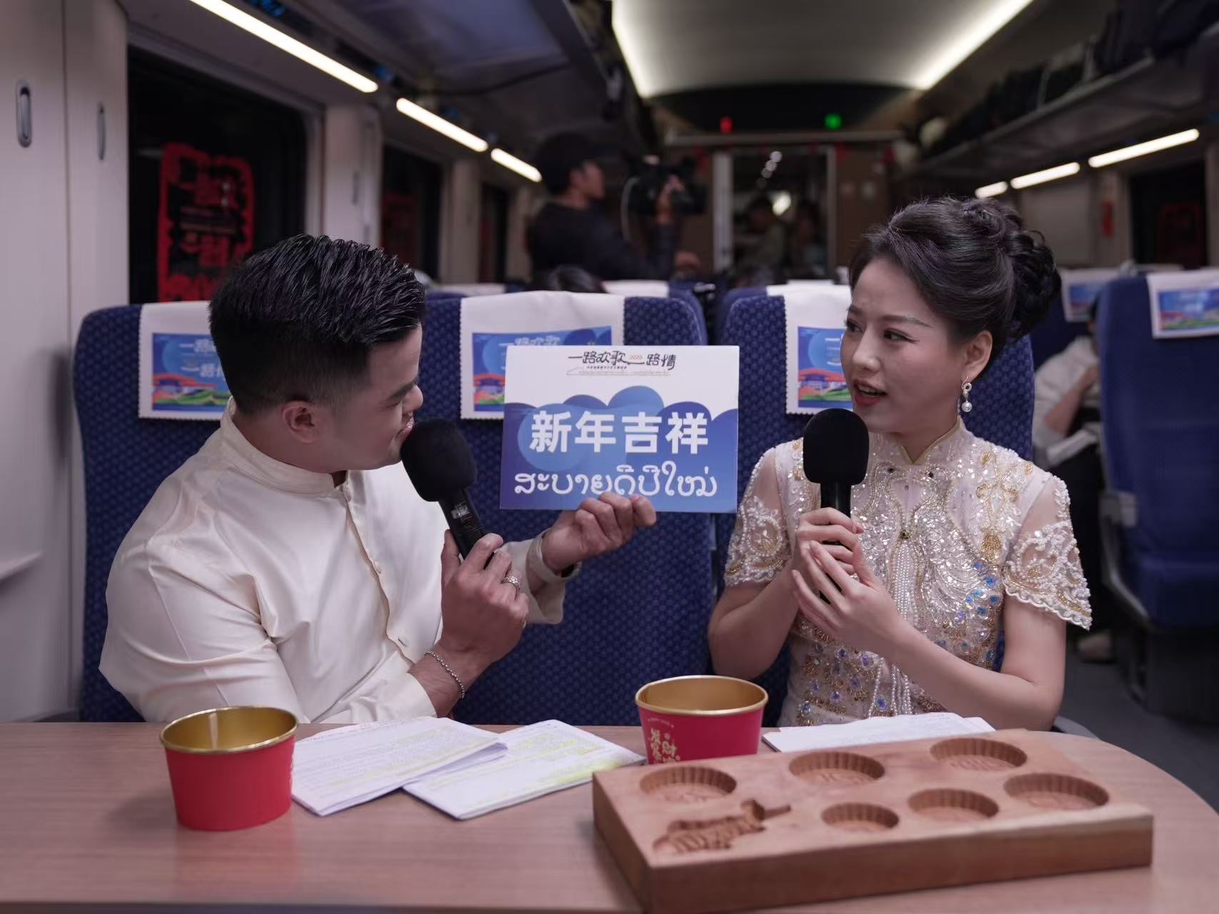 “在1月14日春运首日,我们充分利用列车车厢作为载体,增加了各种充满“年味”的装饰,通过故事分享、车上互动、文艺表演等形式,一路欢歌到老挝万象,与各国游客一同欢庆中国春节申遗成功后的首个’世界年’。”中老铁路D87次国际旅客列车列车长徐青青介绍,这是中老铁路自开通以来首次举办的“跨国列车春晚”,让春节文化通过中老铁路走到国外,让更多的人感受中国春节的独特魅力。