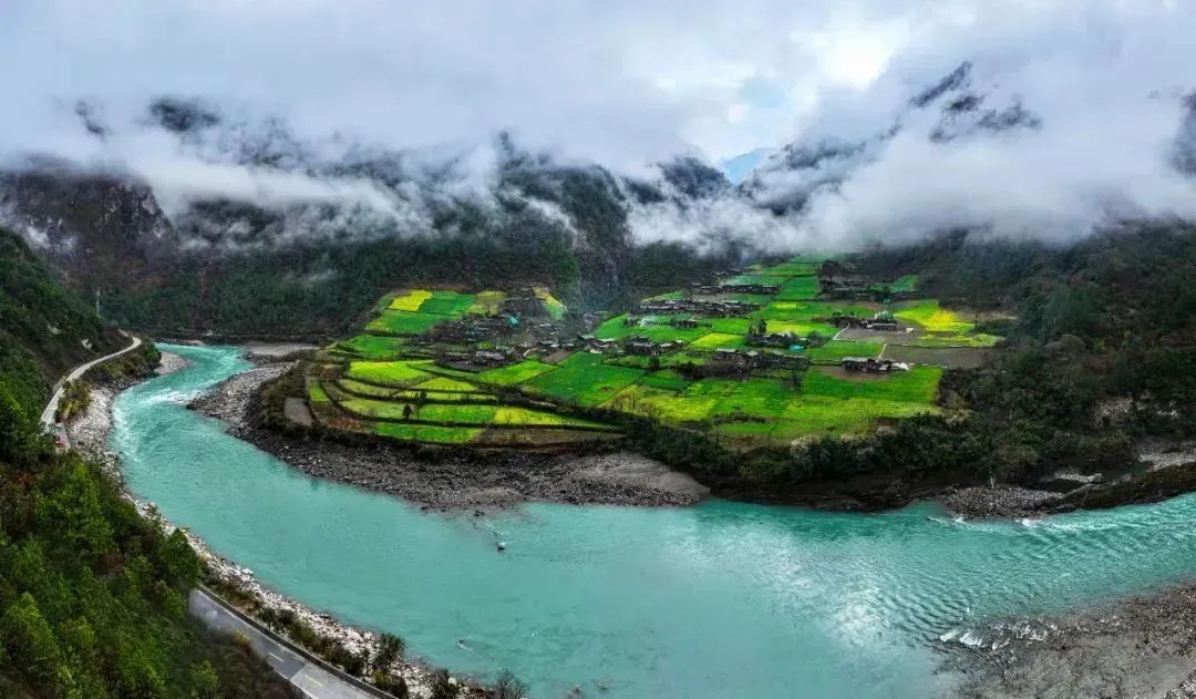 村庄在碧罗雪山脚下,四周青山巍峨,云雾缭绕其间,山川河流形成了天然的屏障,奔腾的怒江水伴着静谧的村庄,动静之间,是一曲大自然的美妙乐章。村子的布局独具匠心,传统的怒族、傈僳族民居错落有致,60余户吊脚楼散落在层层梯田之间,牛羊来回穿梭,鸡鸭成群结队,村民在田间劳作,形成一派绝美的田园风光。