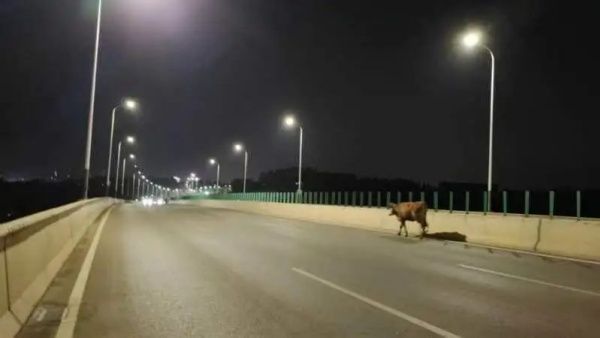 公牛冲上高速“肇事” 民警巧施“美牛计”