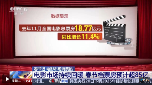 2024年,我国电影市场进入调整期,全年电影票房有所下降。但随着贺岁档和一系列拉动消费的活动到来,电影市场持续回暖。数据显示,去年11月全国电影总票房为18.77亿元,同比增长11.4%,时隔大半年后重回增长轨道。