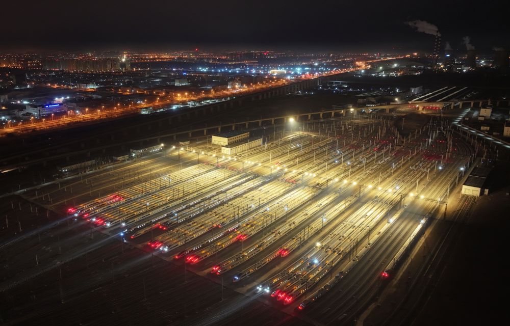 1月14日,动车组列车在铁路天津动车客车段动车运用所停车场整装待发(无人机照片)。新华社记者 李然 摄