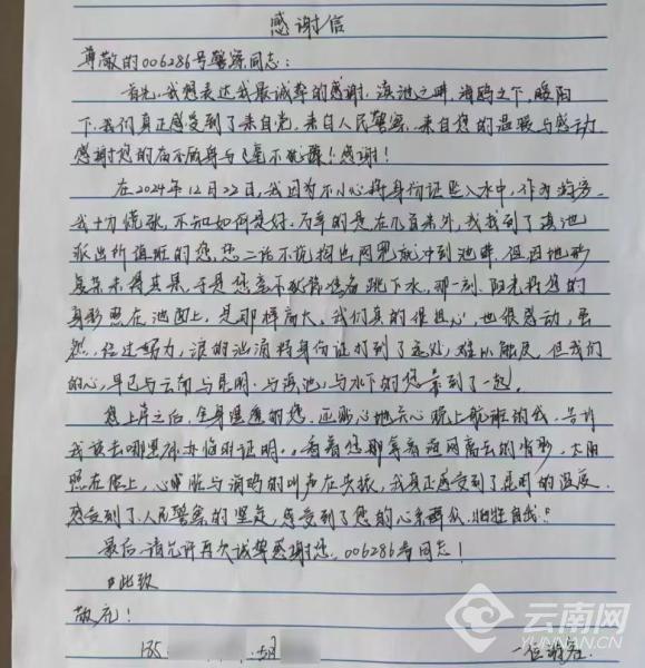 “浪的汹涌将身份证打到了远处,但我们的心早已与云南、昆明与滇池,与水下的您,靠在了一起……”近日,一位跨越千里来到昆明的游客,在昆明市公安局水上治安分局滇池水上派出所,亲手写下一纸温暖的书信。透过娟秀的字迹,一幕感人的画面,慢慢浮出水面。