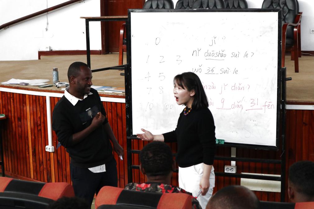 2024年12月2日,在埃塞俄比亚亚的斯亚贝巴大学,孔子学院老师宋瑞荣(右)在教室与学生互动。新华社记者 刘方强 摄