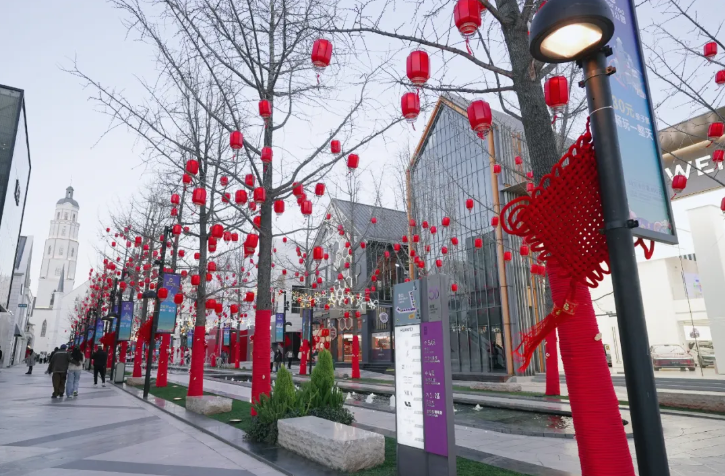 两旁行道树上挂满了红灯笼,每间隔几米还挂上了中国结,树干缠绕上彩绳,打造出既传统又现代的视觉效果,好看又喜庆,各家商铺也纷纷换上新年装扮。