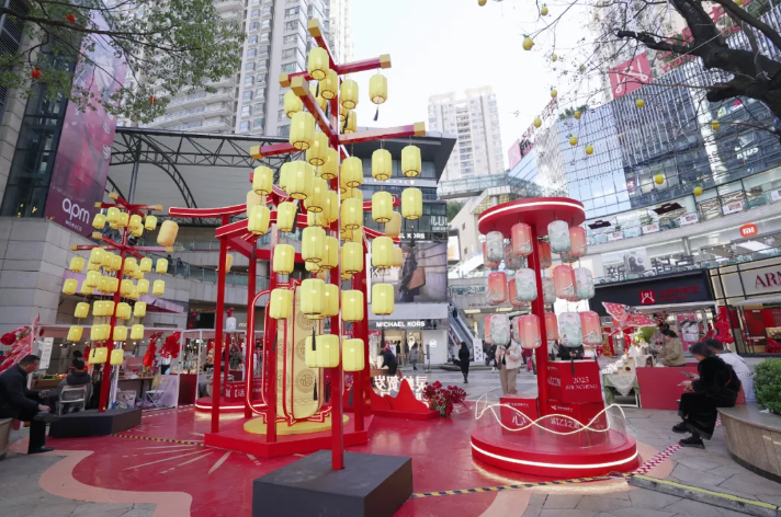 商场正中心区域搭建“灵蛇贺岁 巳巳如意”主题景观,古风亭台建筑风韵独秀,多列灯笼垂直悬挂,两旁树木上也挂满了彩灯,一整个喜气洋洋的氛围。