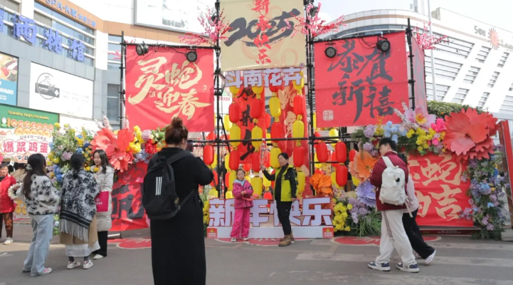灯笼高高挂起,伴着绚丽花朵随风摇曳,喜庆氛围扑面而来。琳琅满目的年货从鲜花绿植到特色美食,从传统手工艺品到时尚饰品应有尽有。