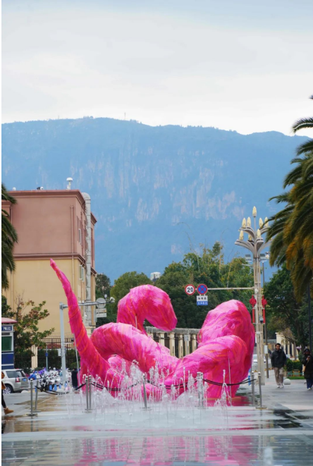 采用环保PVC材质搭建,通过手工编织工艺,以抽象风格将蛇化作写意之形,游走在水间。很新潮又不落俗套,被网友称为“粉麻蛇”。