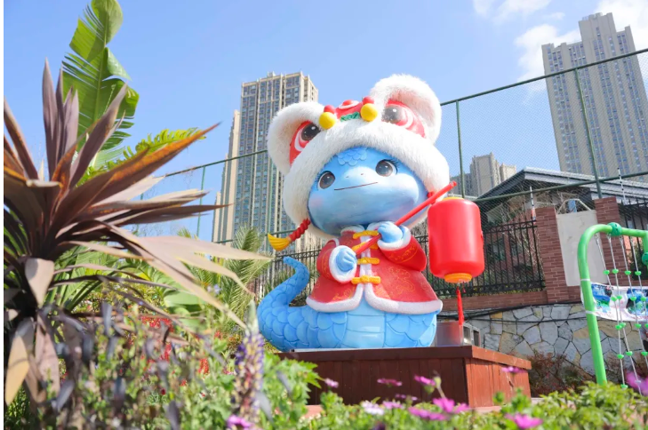 深受网友喜爱小蛇,头顶牡丹身上有祥云等图案,寓意吉祥如意。周围放置了石榴花、灯笼以及一些官渡元素超萌超可爱。