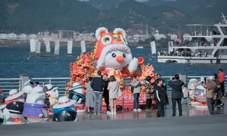 “鸥‘ye’有一种叫云南的生活”主题艺术装置展览亮相,一个高3.6米的巨型红嘴鸥艺术装置格外引人注目。这只海鸥头戴虎头帽身穿春节红色汉服,身绕繁花寓意,将新年的期许融入传统文化,为市民和游客送上新春祝福。