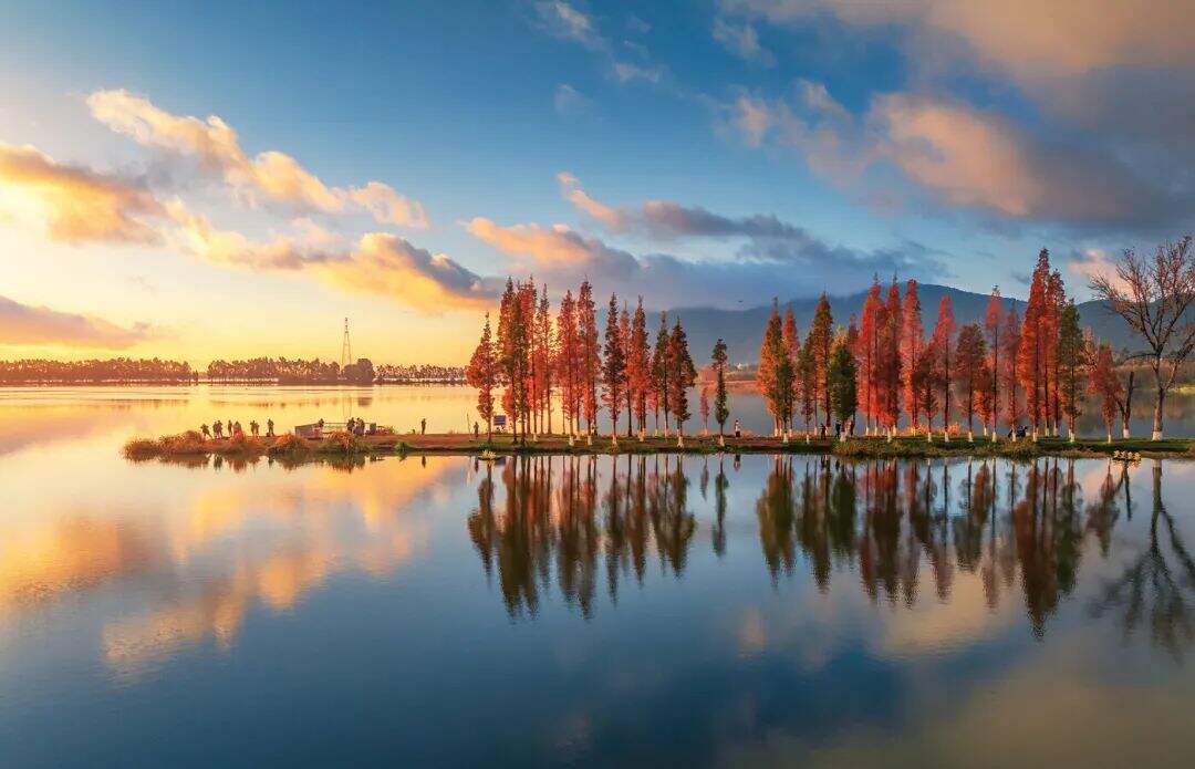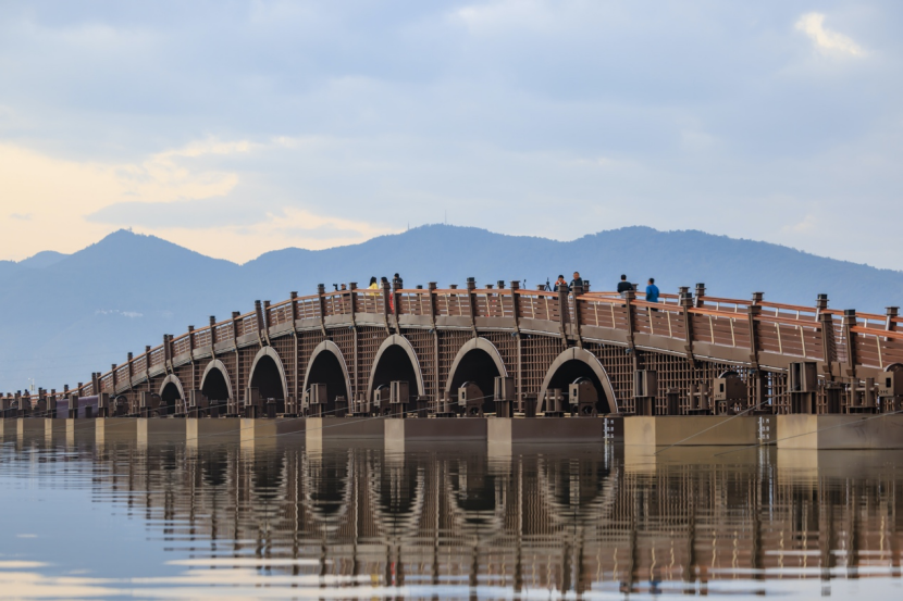 站在浮桥上,向西可远眺西山睡美人的婀娜多姿,向东可瞭望昆明主城区的城市天际线,湖光山色尽收眼底。栖息在草海的红嘴鸥时不时会飞至此处,与人们进行亲密互动。