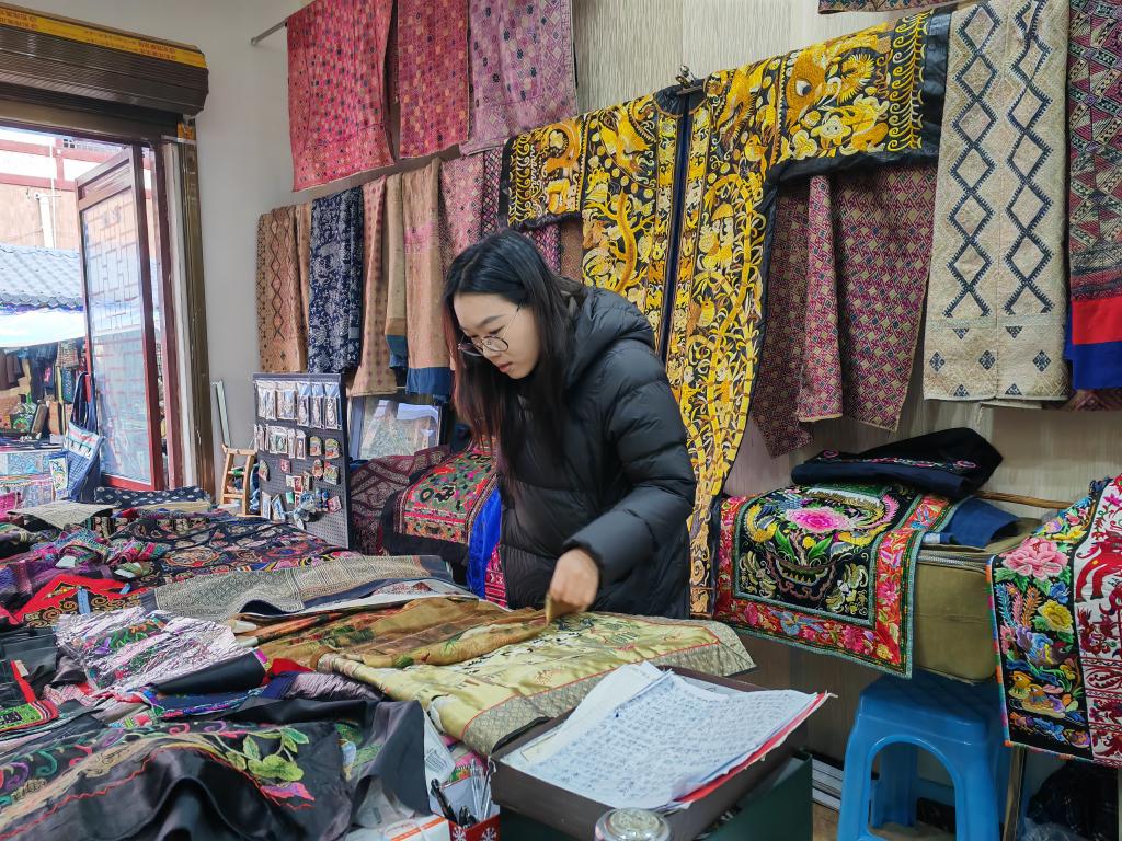 年近八旬的苗族绣娘潘玉珍,来自黔东南州台江县,她5岁就跟随母亲学习刺绣手艺,做刺绣多年,如今依然精神矍铄。她的店铺里,往来的游客络绎不绝,其中不乏外国游客。