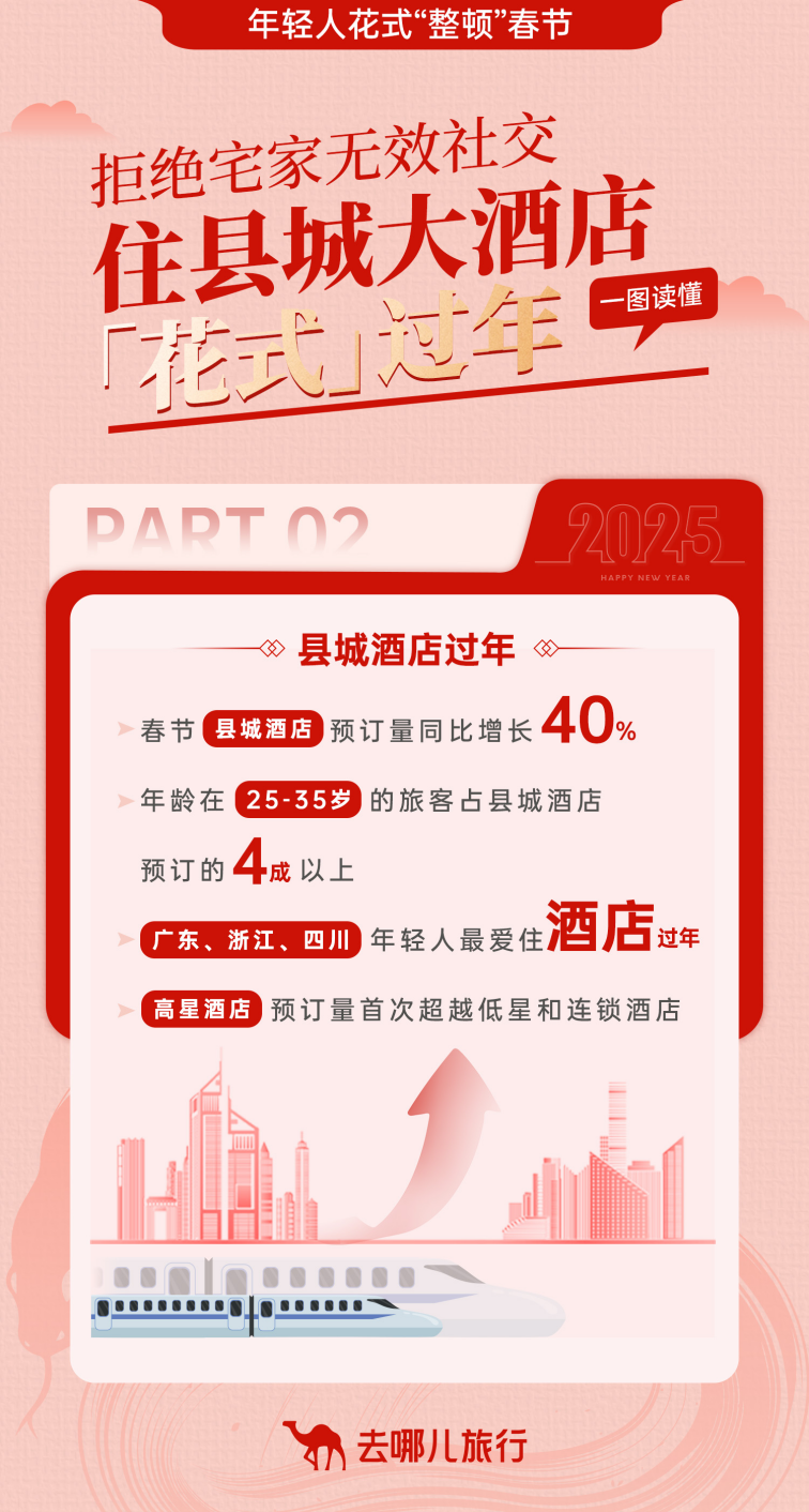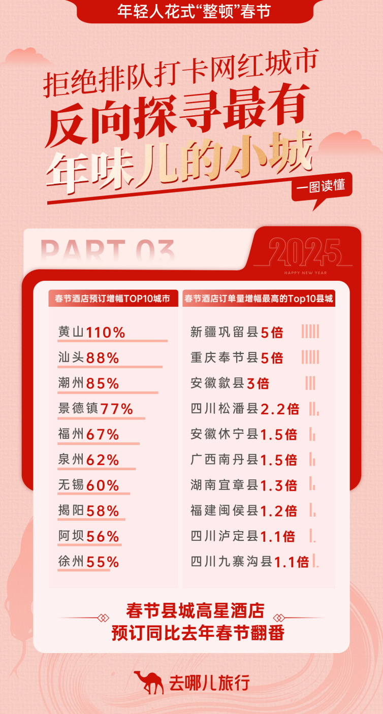 但春节“吸金”能力飙升最快的还数县城。去哪儿平台预订数据显示,今年春节县城高星酒店预订同比去年春节翻番,预订占比超过连锁和低星酒店。春节酒店订单量增幅最高的Top10县城是新疆巩留县、重庆奉节县、安徽歙县、四川松潘县、安徽休宁县、广西南丹县、湖南宜章县、福建闽侯县、四川泸定县、四川九寨沟县。蔡木子分析,能在春节“抓”住年轻旅客的县城,都有一些共同特点,独有的旅游资源+新开交通线路+新建酒店拉动。如巩留县位于新疆伊犁,冬季冰雪旅游资源丰富,首家五星级酒店于去年底开业;九寨沟去年通了高铁,从省会成都到九寨沟的时间大大缩减。高铁开通以来,带动九寨沟县旅游预订增速一直名列前茅。