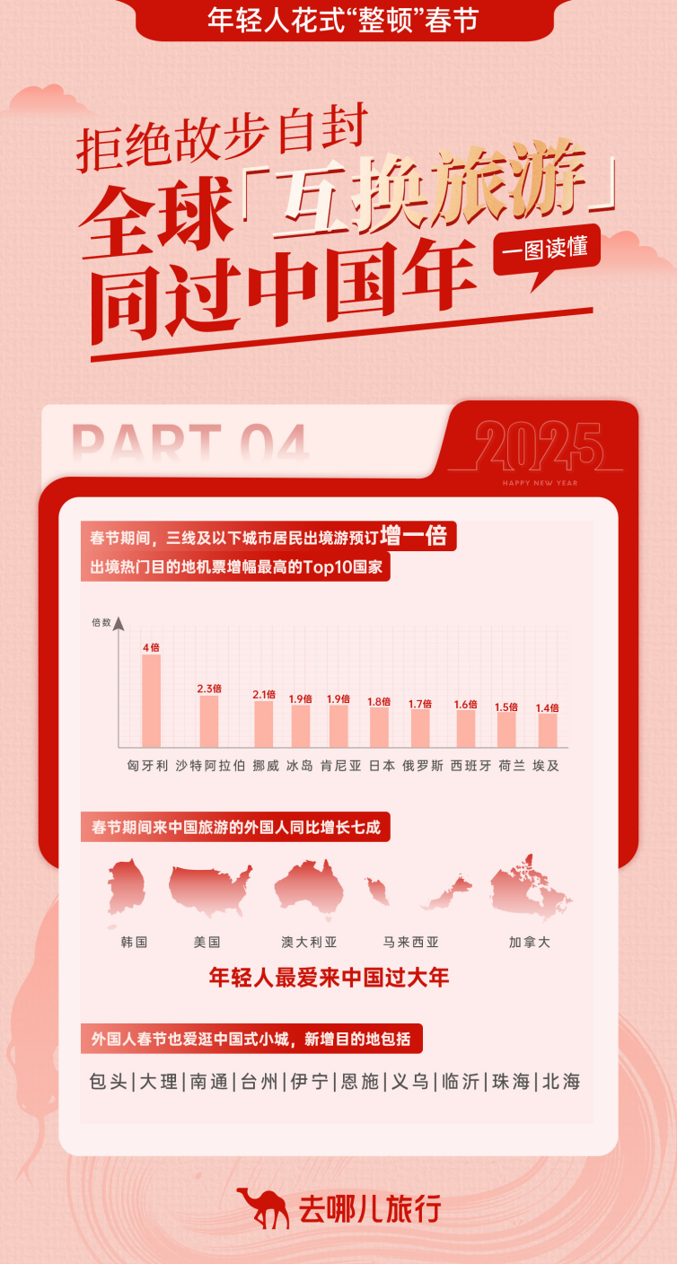 这个春节,中国青年闯北极看极光,外国小哥小姐姐来一场China Travel,全世界“互换旅游”,同过中国年。从去哪儿平台预订来看,今年春节,中国游客的足迹遍布全球2100余个境外城市,较去年增长五成。出境热门目的地机票增幅最高的Top10国家是匈牙利,沙特阿拉伯,挪威、冰岛、肯尼亚、日本、俄罗斯、西班牙、荷兰、埃及。从国际机票和酒店预订量来看,热门出境游目的地包括日本、泰国、马来西亚、中国香港、韩国、新加坡、印度尼西亚、美国、越南、澳大利亚等。