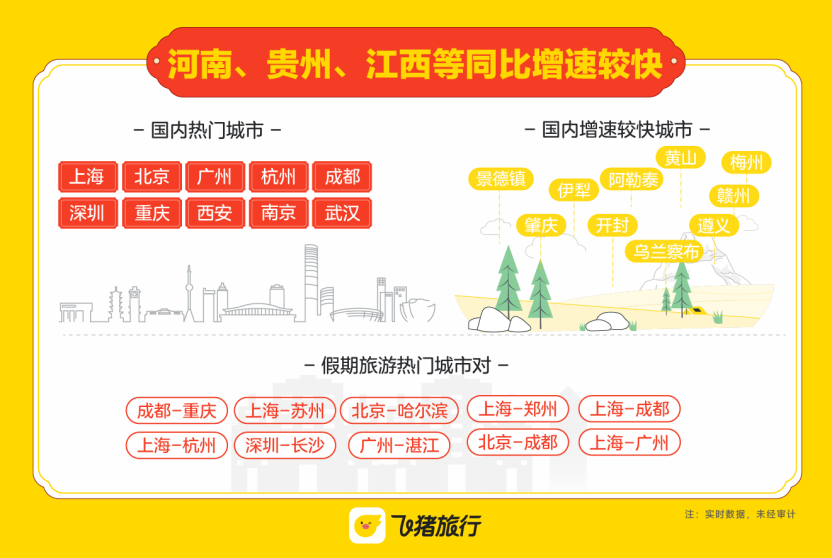 报告显示,在“请2休11”“请4休13”等带动下,这个春节假期大家玩得更久、更远,消费也更多,其中国内游人均消费同比去年提升近10%,人均住宿时长同比提升5%。从目的地来看,广东、上海、浙江、北京、四川等省市在出游规模上领先,河南、贵州、江西、黑龙江、山西等省份增速较快;上海、北京、广州、杭州、成都、深圳、重庆、西安、南京、武汉等是最热门城市,景德镇、肇庆、伊犁、阿勒泰、开封、黄山、乌兰察布、梅州、赣州、遵义等城市增速最快。