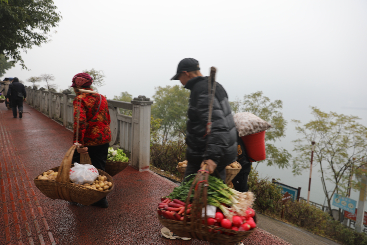 10时,“渝忠客2180”抵达西山码头,比原计划晚了1个小时。船一靠岸,就有人赶来帮老人把菜篓搬下船。100多级码头阶梯上,肩挑的、背扛的、手提的……全是卖菜和帮忙的人。