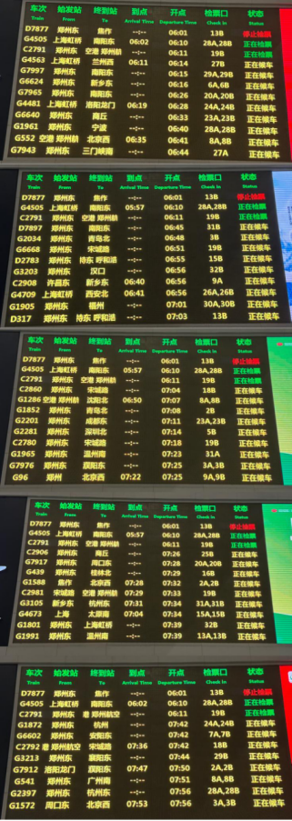 2月3日早上6点,郑州东站电子屏上显示了47趟待发列车(杨登媛摄)