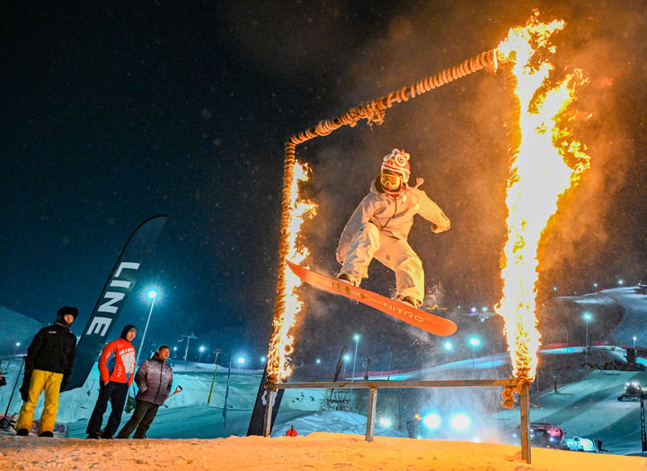 在坐落于阿勒泰市城区的新疆将军山国际滑雪度假区,雪友在新春趣味滑雪公园跳台活动中钻过火圈(2025年1月29日摄)。新华社记者陈朔/摄