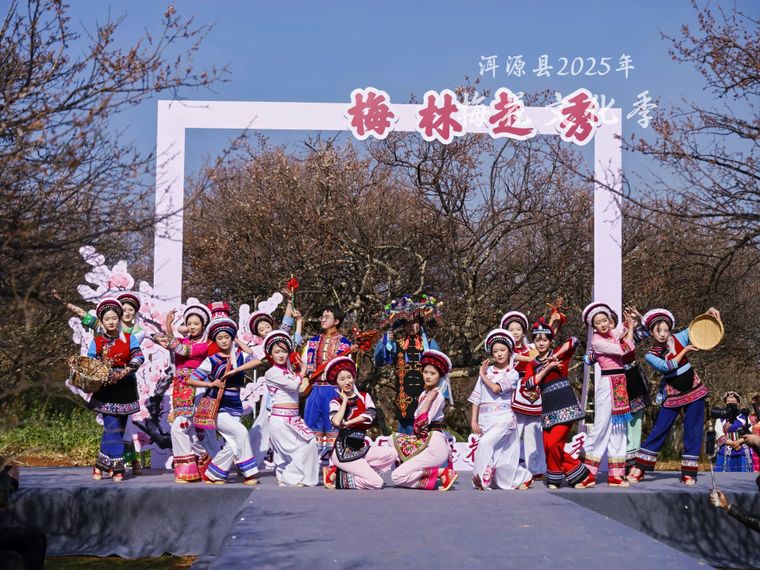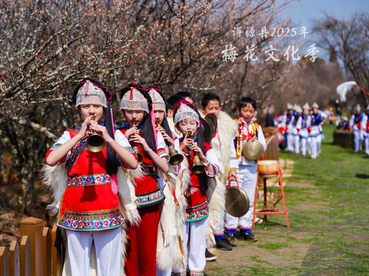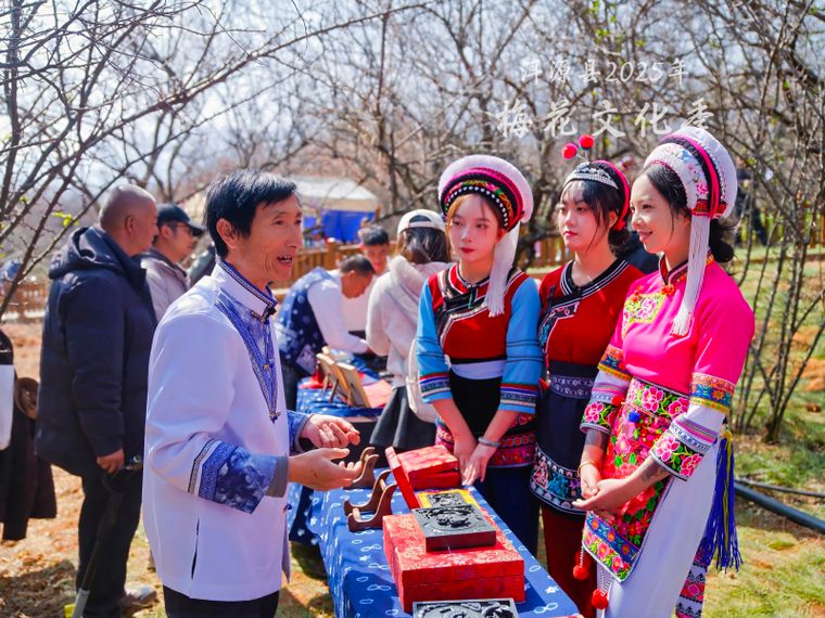 活动现场,主持人携手多位嘉宾,带领广大观众一同体验非遗唢呐、白鹤舞的精彩表演,漫步在如诗如画的梅林中欣赏美景,观看西山调的现场创作,领略甲马、乳扇等非遗技艺的独特魅力,聆听嘉宾及诗歌爱好者对梅花的喜爱,接受三营南大坪梅园、洱宝梅花园等6大梅园见证人送出的美好祝福,还欣赏到画家现场挥毫泼墨,绘制出一幅幅栩栩如生的梅花画卷。