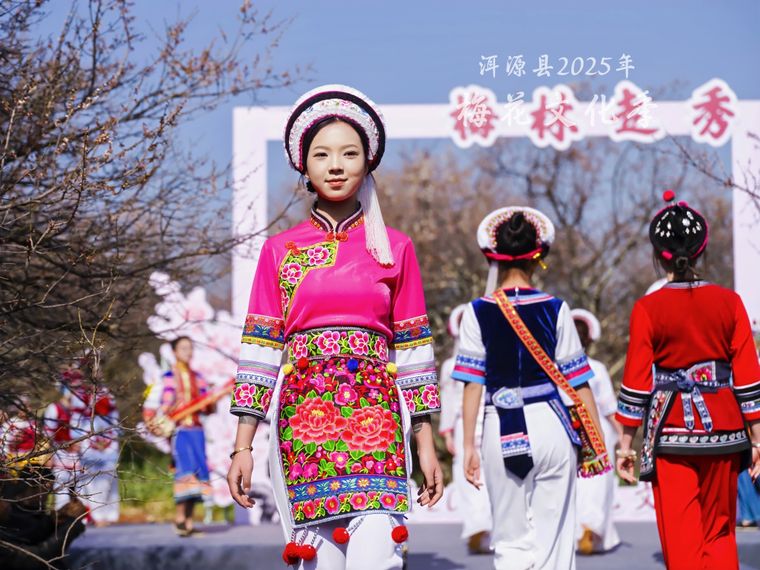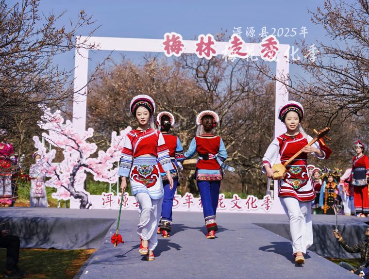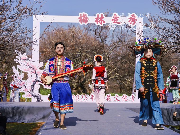 与此同时,现场的梅林走秀活动同样精彩纷呈,令人翘首以盼。洱源县汇聚了26个民族,各民族服饰色彩斑斓、工艺精良,风格各异。在洱源县2025年梅花文化季期间,组委会精心策划了梅林走秀活动,旨在让各族群众身着本民族服饰,自信踏上T台,成为舞台焦点。活动当天,来自九个乡镇的走秀队伍身穿独具特色的民族服饰,于梅林之中共同演绎独特的民族风情,诠释民族文化历久弥新的魅力与时代内涵,为观众呈现一场视觉与文化的双重盛宴。