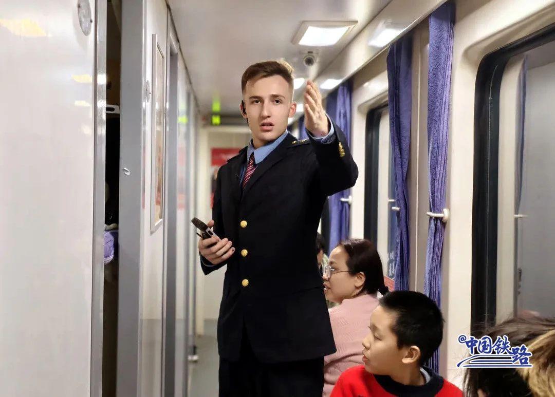 今年,努热西拉·艾米热阿拉迎来职业生涯中的第二个春运。除夕当天,他和同事们没有回家,依然坚守在岗位上。当晚,列车上热闹非凡,一场温馨的联欢会如期举办。随着音乐声响起,努热西拉·艾米热阿拉跳起帅气的鹰舞,车厢里响起阵阵欢呼声。