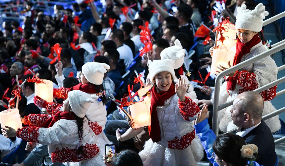 当晚,在开幕式分会场冰雪大世界,手提冰灯的孩子们来到占地百万平方米的园区,与冠军火炬手一同滑行,见证主火炬点燃。