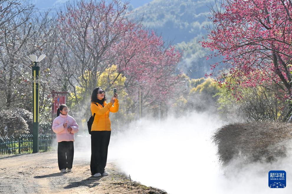 2月9日,游客在霞浦县玉潭樱花谷生态科技园游玩。新华社记者 姜克红 摄