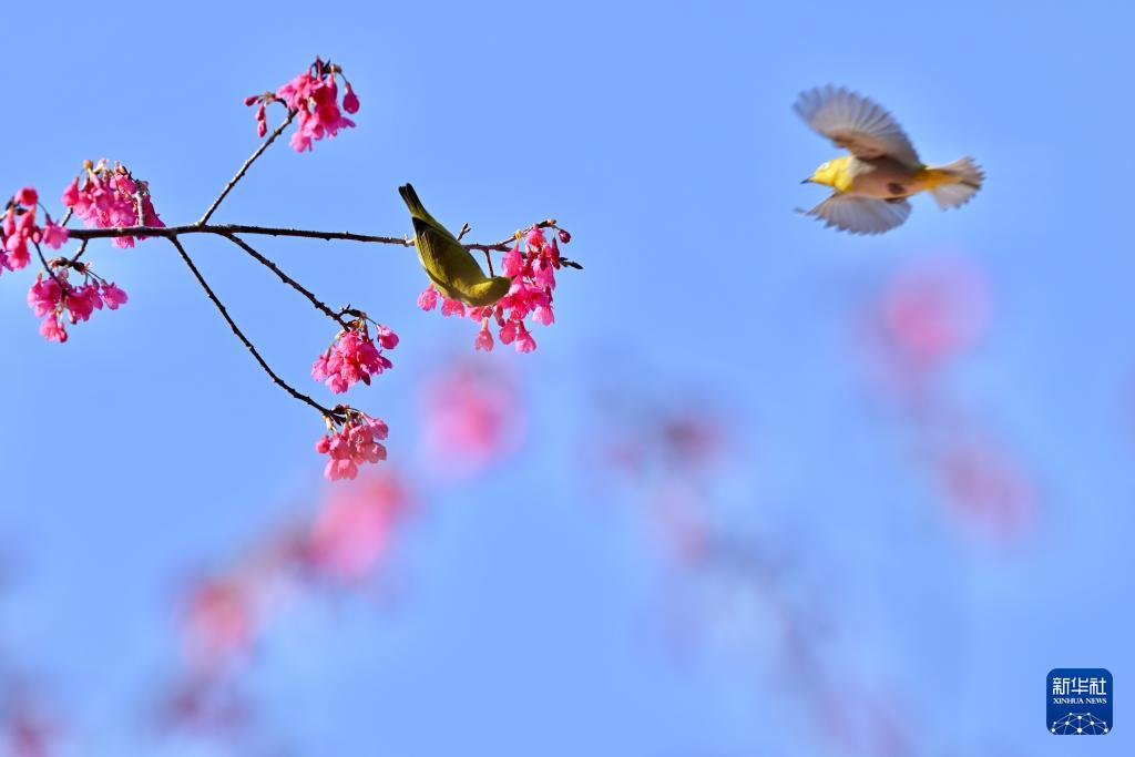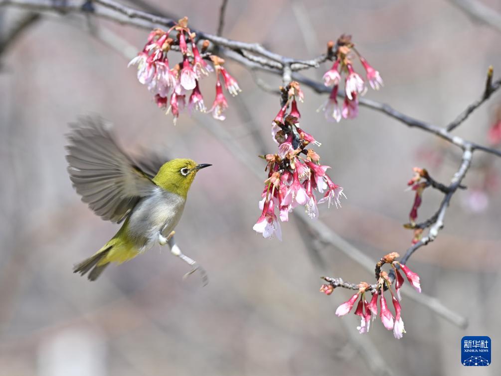 2月9日,绣眼鸟在霞浦县玉潭樱花谷生态科技园觅食樱花蜜。新华社记者 姜克红 摄