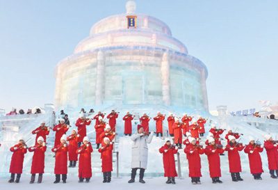 漫步冰雪大世界,一处处冰雕引人赞叹。今年,园区共设置了东亚区、中亚区、西亚区、南亚区等九大分区,用冰雕呈现各地地标景观,让游客在冰情雪韵中“游遍亚洲”。